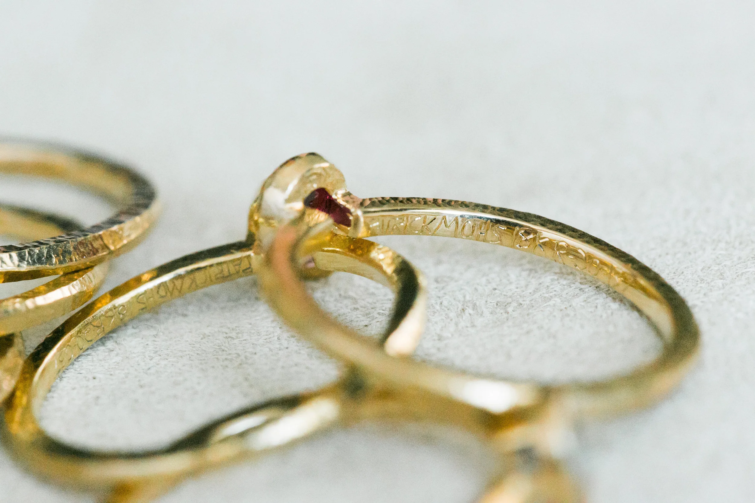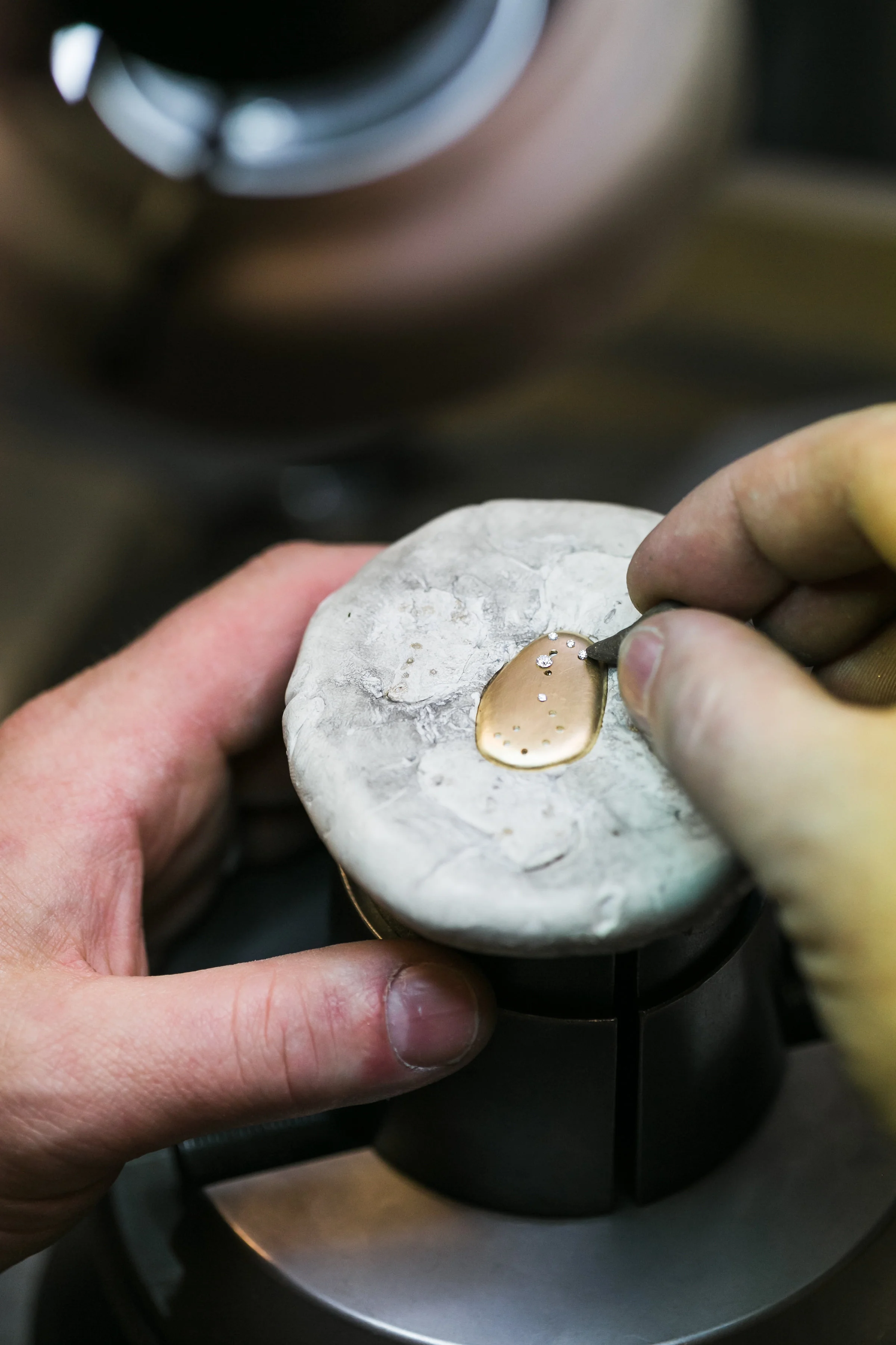 Gems all fit by hand under a microscope using a rotary burr. Cutting gold away bit by bit until the gem fits snugly and is ready to be set.